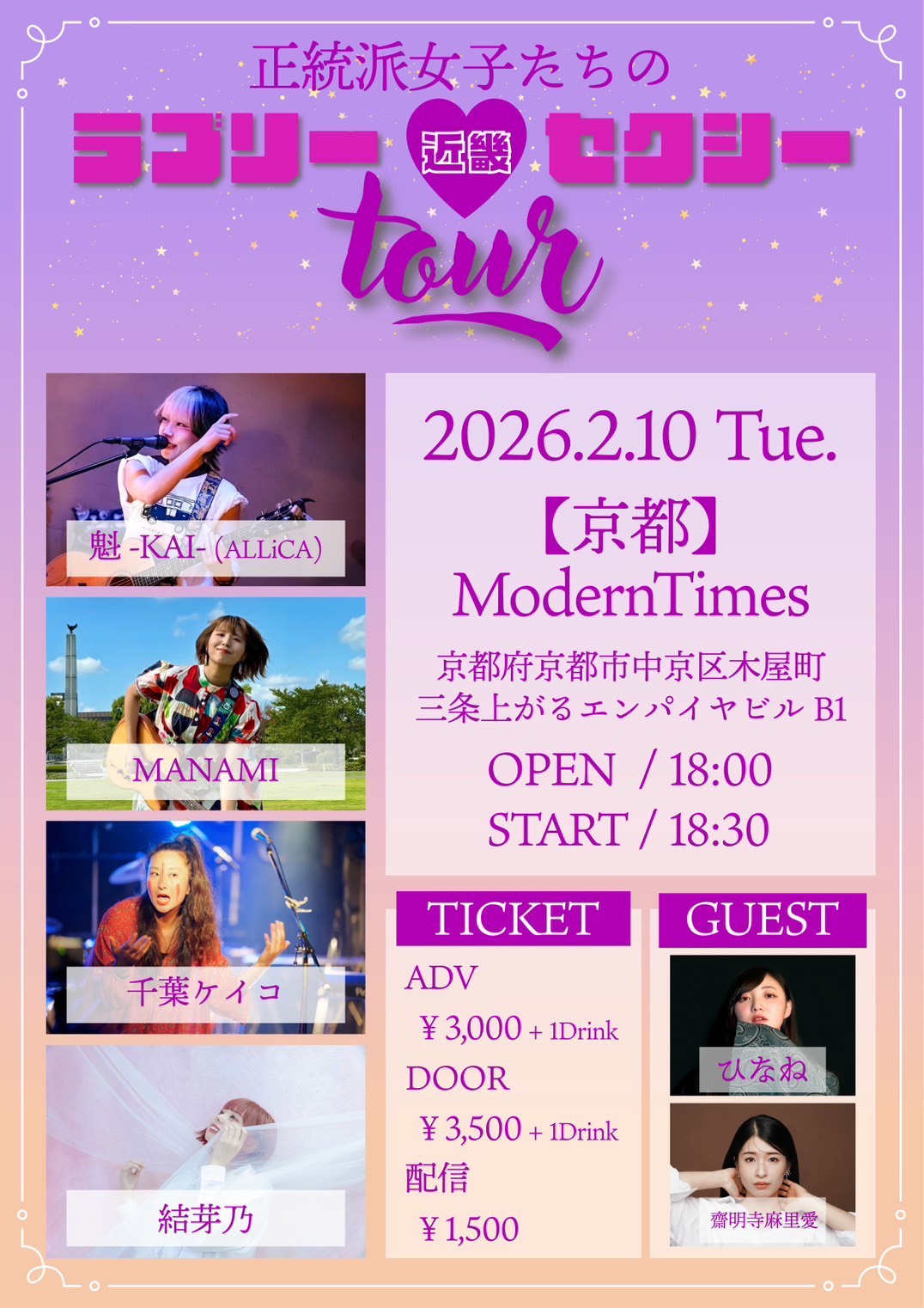<タイムテーブル> 18:30 千葉ケイコ 19:00 斎明寺麻里愛 19:30 MANAMI 20:00 ひなね 20:30 魁 21:00 結芽乃 <配信チケット>1500円