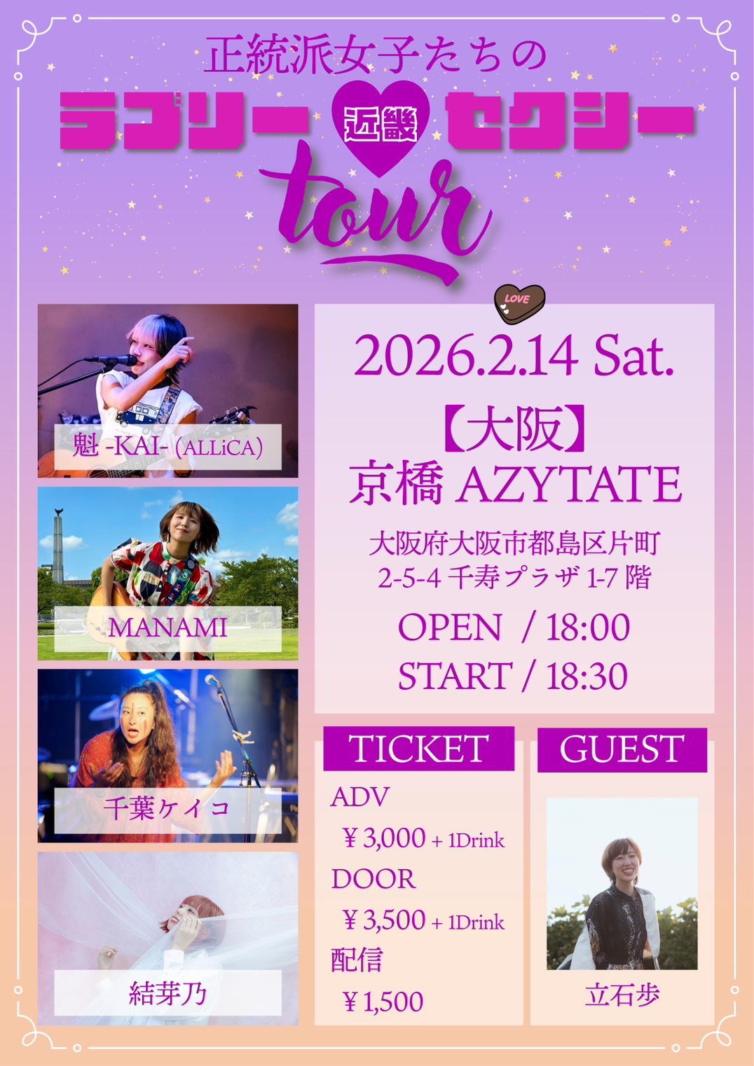 <タイムテーブル> 18:30 千葉ケイコ 19:05結芽乃 19:40 立石 歩 20:15魁 20:50 MANAMI <配信チケット>¥1,500