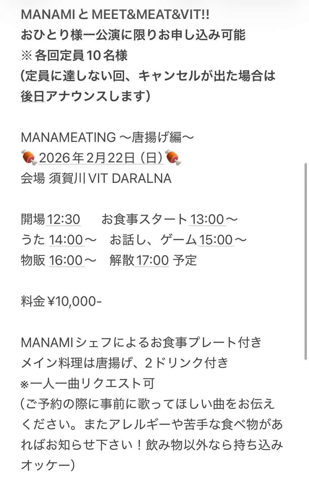 MANAMIシェフによるお食事プレート付き メイン料理は唐揚げ、2ドリンク付き ※一人一曲リクエスト可 (ご予約の際に事前に歌ってほしい曲をお伝えください。またアレルギーや苦手な食べ物があればお知らせ下さい!飲み物以外なら持ち込みオッケー) 開場12:30 お食事スタート13:00〜 うた 14:00〜 お話し、ゲーム15:00〜 物販 16:00〜 解散17:00 予定