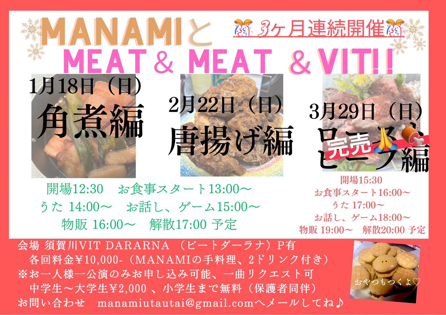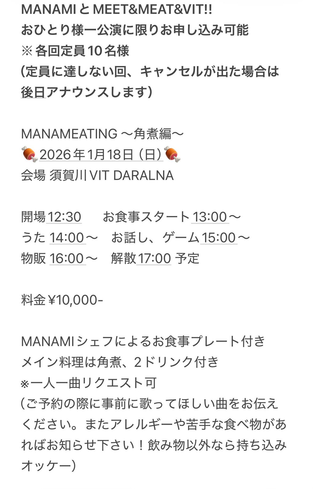 MANAMIシェフによるお食事プレート付き メイン料理は角煮、2ドリンク付き ※一人一曲リクエスト可 (ご予約の際に事前に歌ってほしい曲をお伝えください。またアレルギーや苦手な食べ物があればお知らせ下さい!飲み物以外なら持ち込みオッケー) <当日スケジュ―ル>※進行によって前後することがあります。 開場12:30 お食事スタート13:00〜 うた 14:00〜 お話し、ゲーム15:00〜 物販 16:00〜 解散17:00 予定